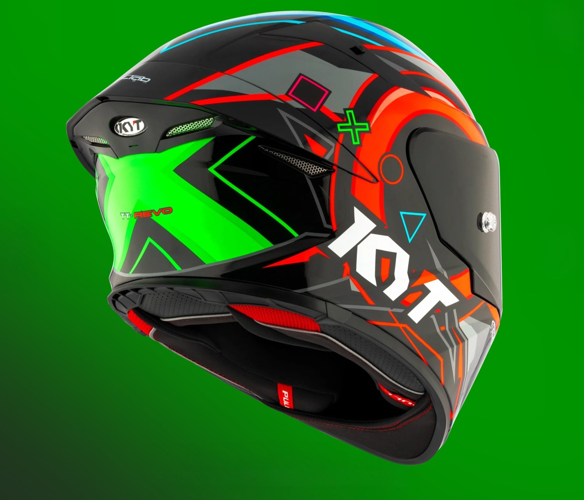 Particular channelings obtained on polystyrene, allow to work in symbiosis with the several air intakes an optimal ventilation into the helmet and a quickly exhaust of the hot air. TT Revo has five air intakes on the front and four air extractors under the aerodynamics spoiler.