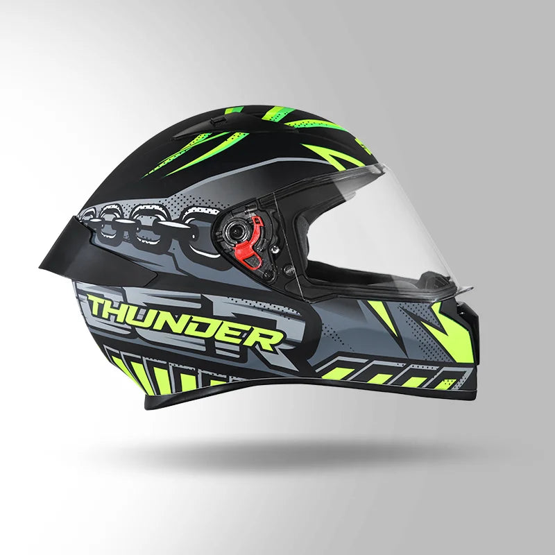 The Thunder D5 is a full-face helmet featuring a spoiler for enhanced aerodynamics. Its high-impact outer shell and regulated density EPS ensure top-notch protection. The dynamic ventilation system keeps you cool, while the hypoallergenic, replaceable liner guarantees comfort and hygiene. With a quick-release visor and chin strap for convenience, this helmet prioritizes safety and ease of use.