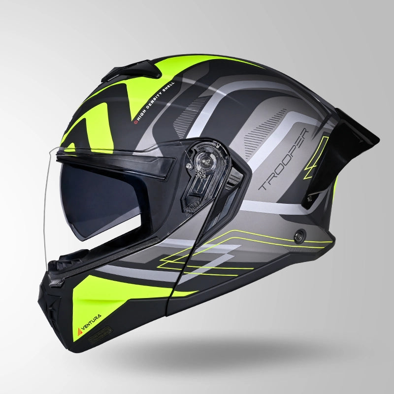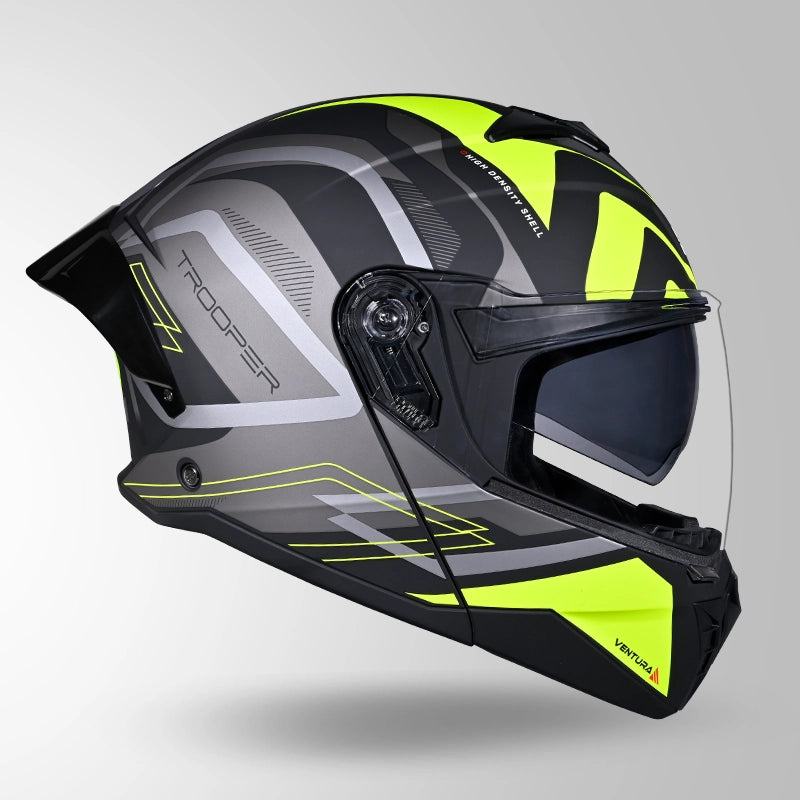 Discover the perfect blend of safety and style with the Trooper Decor. This innovative flip-up full-face helmet combines exceptional convenience with superior protection. Featuring a quick-release visor, ISI and DOT certifications, and a high-impact-resistant outer shell, it offers unmatched durability. The rust-proof stainless-steel buckle adds reliability, while the dynamic ventilation system ensures optimal airflow for a cool and comfortable ride. Ideal for riders who value top-notch safety, functionality, and design.