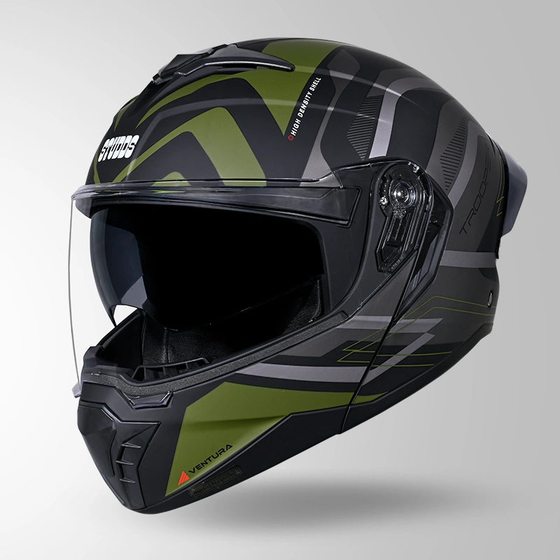 Discover the perfect blend of safety and style with the Trooper Decor. This innovative flip-up full-face helmet combines exceptional convenience with superior protection. Featuring a quick-release visor, ISI and DOT certifications, and a high-impact-resistant outer shell, it offers unmatched durability. The rust-proof stainless-steel buckle adds reliability, while the dynamic ventilation system ensures optimal airflow for a cool and comfortable ride. Ideal for riders who value top-notch safety, functionality, and design.
