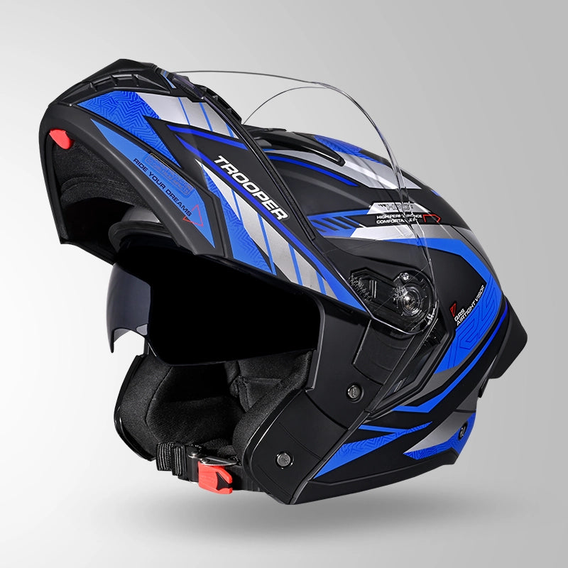 Discover the perfect blend of safety and style with the Trooper Decor. This innovative flip-up full-face helmet combines exceptional convenience with superior protection. Featuring a quick-release visor, ISI and DOT certifications, and a high-impact-resistant outer shell, it offers unmatched durability. The rust-proof stainless-steel buckle adds reliability, while the dynamic ventilation system ensures optimal airflow for a cool and comfortable ride. Ideal for riders who value top-notch safety, functionality, and design.