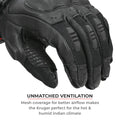 - Designed for Indian weather: We use heavy duty 3D mesh on the upper part of the gloves for superior ventilation with perforated leather on the lower part. This allows sweat to evaporate quickly making your rides during hot weather more comfortable!